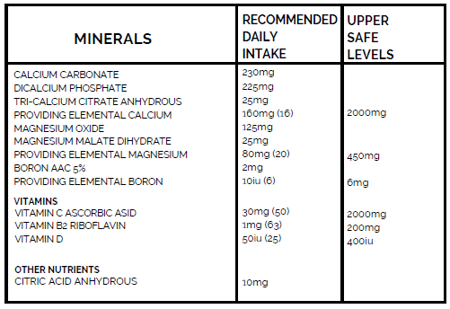 Ingredients: Calcium, Magnesium, Boron, VITC, VITB2, VITD